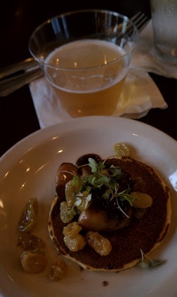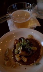 Next, we got Dogfish Head Noble Rot which was a beer I had never had before. It was paired with a cornmeal pancake, wine soaked raisins and…foie gras. Do you know what fois gras is? I thought it was cow liver pate and I was okay with that. It came in a cube and I thought well, okay, whatever and popped it in my mouth. Then I found out what it really was–it’s motherfucking GOOSE LIVER. Seriously? Oy. Did I just eat goose liver?!?! OTOH, geese can suck me. They shit all over the place and laugh when you step in it.