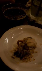 Next was the main course and the only course that didn’t work for me. It featured a rare lamb chop. I do not eat rare food or medium rare food or medium food or even medium well food…if it is leaky blood juice, I do not put it in my mouth. My friend Amy & our tablemates happily took the chops off my hands, leaving me to enjoy the sweet potato puree and fried leeks. I also got a second helping of the puree when I told the nice server about my issues with blood. (Interestingly, I have seen blood coming out of people on several occasions and it never bothered me…of course, I didn’t have to eat the people afterwards). This course was paired with Stone’s 10th Anniversary Ruination. This beer was a little too strong for me and kind of killed the taste of the food. I think I would have liked it better on its own.